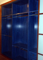 Revestimiento, en melamina azul, de hueco para armario empotrado de cuatro puertas correderas, dotadas de