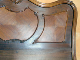Cabecero y piecera, macizos de Nogal y chapa de Nogal Español, estilo Luis XV.